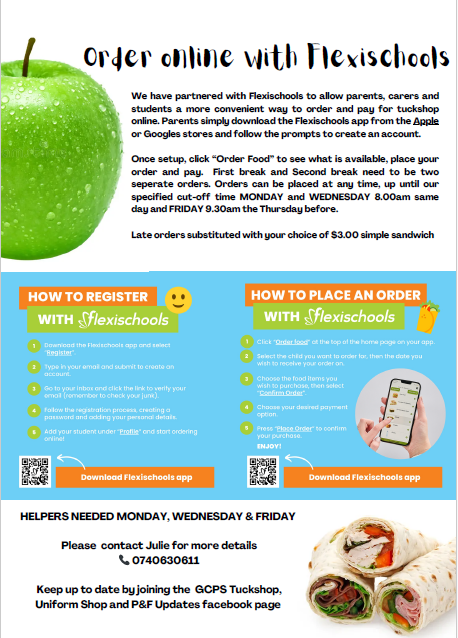 Currently the school tuckshop operates Monday, Wednesday and Friday each week. It is staffed with a paid convener who is assisted by volunteer parents. Tuckshop opens at 8:00a.m. and closes at 2:00p.m. Students may pre-order lunches from an extensive list of foods and drinks. These orders are prepared and organised, then sent to classrooms for distribution prior to Morning Tea and Lunch breaks. Students may also purchase snacks over the counter during each lunch. Friday lunch orders need to be brought to school on Thursday for processing.